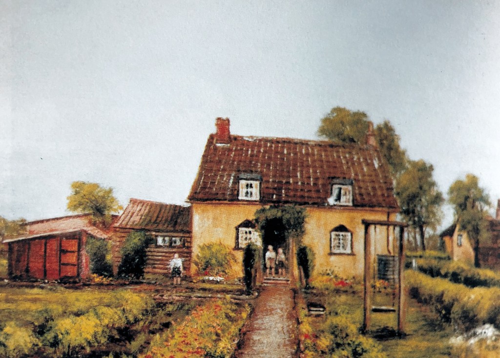 As you continue your walk past the shop maybe you’ll drop in for some light refreshment. Maybe this is the Adams family waiting to invite you in?The old village hall which was built on land opposite the shop where 98a and 98b High Street now stand. It was built after the First World War. The much improved village hall in Gold Street was opened in 1979.On the left there is the Old Swan Pub now known as White House, which was granted a beerhouse licence in 1869.Cobblestones is on the right next to where the old village hall was sited. Joseph & Mary Gell with their baby are posing for the photo. The barn on the right was a workshop for making parts for shoes. Shoemaking and leatherworks were a major industry in this area.