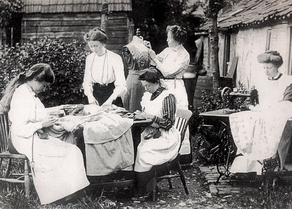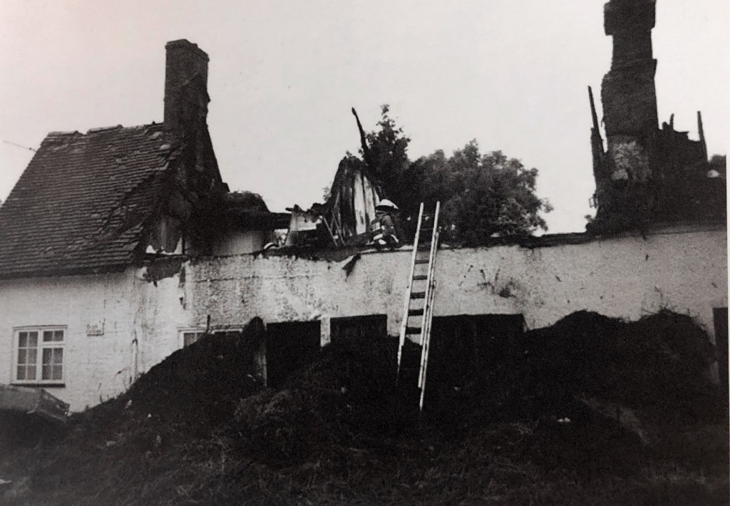 On the right of the road are the cottages at 61 – 67 High Street. If you look closely in the old photo Number 61 has a Lyons Tea sign over the window. It used to be a shop. (Move the slider to see the old and new pictures)The Dickens family dressmaking at the back of 61-67 High Street in the 1920s.The terrible fire damage in 2002 at 61-67 High Street. The houses have since been beautifully restored.