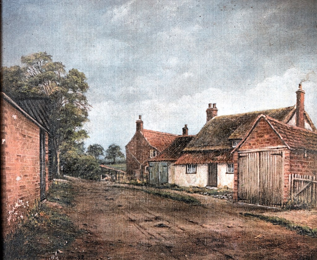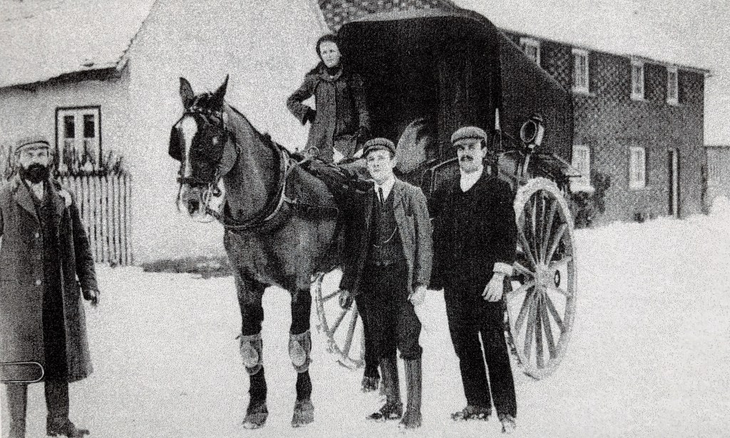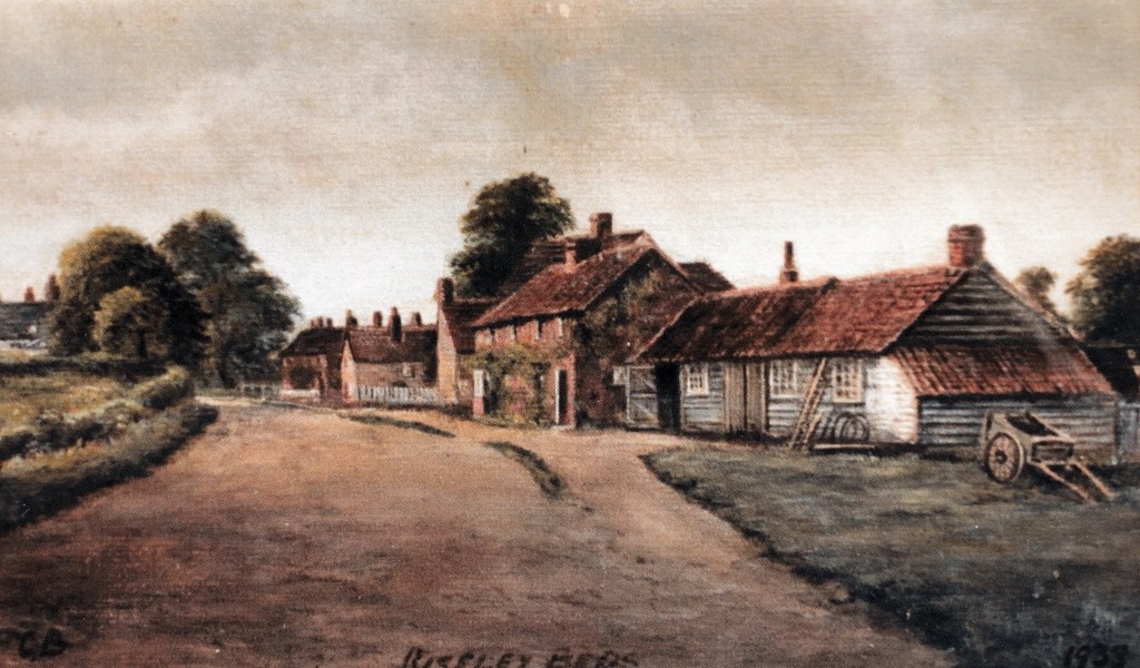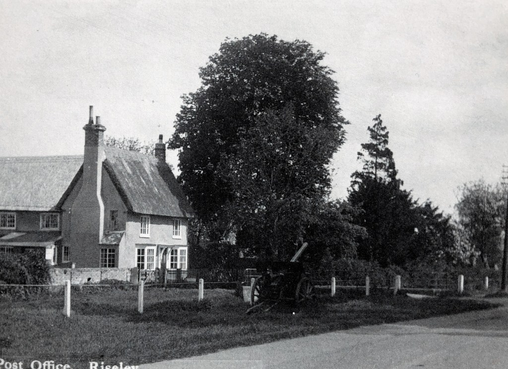 The Five Bells pub, closed in 2012, is now a private dwelling, with another house behind in what was its garden. The Five Bells pub was a farmhouse prior to 1810. The annual fair was held on the green in front of the Five Bells.Each village had its feast day. Riseley’s Feast Sunday is generally held to be the Sunday after 19th July. The celebration here is in front of the Five Bells pub.High Barn House is on the right opposite the Five Bells Pub. After WW1 most villages were presented with captured German cannons. This cannon stood on the green in front of High Barn House until removed for scrap in WW2.High Barn House was the farmhouse of High Barn Farm. In this photo, taken in the field that was beside the house, are three generations of the King family who lived there for many years.High Barn Farm, 1909In the 1920s High Barn House was described as “The Post Office with Dairy, Stabling, 3 pig-styes, fowl shed, cow house and chaff-shed”. It was also the public telephone office with a phone box. This photo is the side view of the house.Litchfield’s workshop painted by Charles Brooks on the 1950s. This site is now the Police Post.Next to 35 High Street was Litchfield carpenters and wheelwrights sited in a wooden building where the Police Post now stands. Wheels, coffins and other wood and metal items were crafted in the sheds. The picture is of Eli Litchfield with a wheel he made.Litchfield’s workshop beside Carpenter’s Cottage.35-37 High Street – a delivery by Valentine’s Bakery on a winter morning outside what was once the dairy of College Farm with Carpenter’s Cottage behind. This location is now where College Drive meets the High Street.